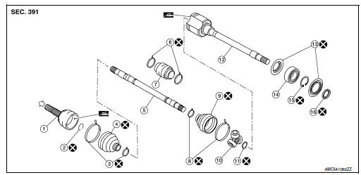 - Inspect the components. Refer to FAX-24, "6M/T : Inspection".