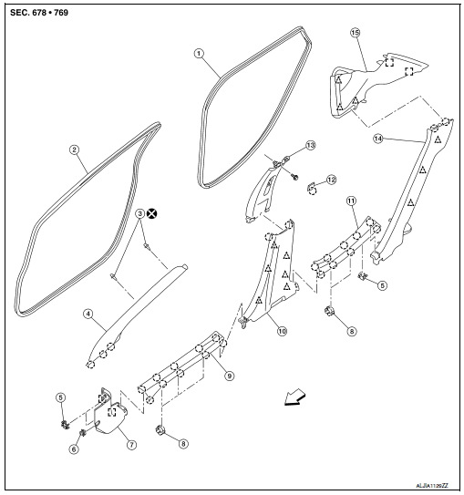 - Remove front and rear body side welts. Refer to INT-27, "BODY SIDE WELT