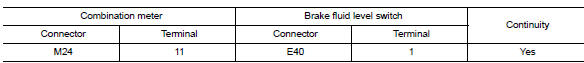 Check continuity between combination meter connector m24 terminal 11 and brake fluid level switch connector e40 terminal 1.