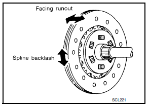 Maximum allowable spline backlash (at outer edge of disc) : Refer to CL-20, "Clutch Disc".