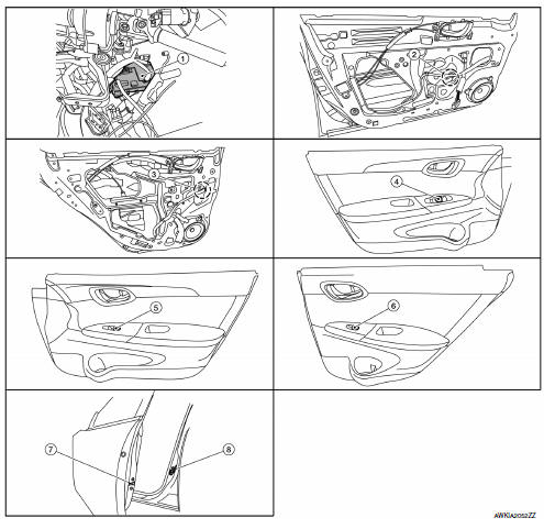 | Front power window motor RH | Starts operating with signals from main power window and door lock/unlock switch & power window and door lock/unlock switch RH. |
