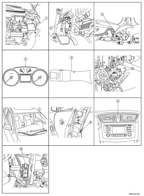 | Combination switch (Lighting & turn signal switch) | Refer to BCS-9, "COMBINATION SWITCH READING SYSTEM : System Description" (with Intelligent Key system) or BCS-80, "COMBINATION SWITCH READING SYSTEM : System Description" (without Intelligent Key system). |
