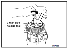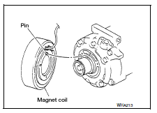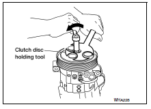 When replacing compressor clutch assembly, always conduct the break-in operation. This is done by engaging and disengaging the clutch about 30 times. Break-in operation raises the level of transmitted torque.