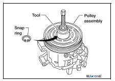 Check the appearance of the pulley assembly. If the contact surface of the pulley shows signs of excessive grooving, replace the clutch disc and pulley. The contact surfaces of the pulley assembly should be cleaned with a suitable solvent before installation.
