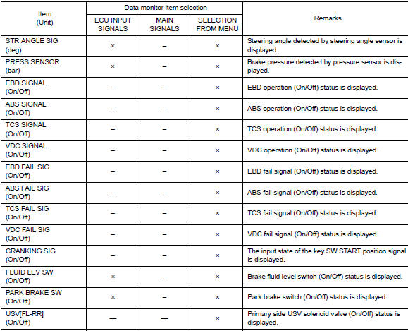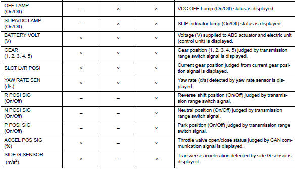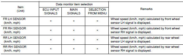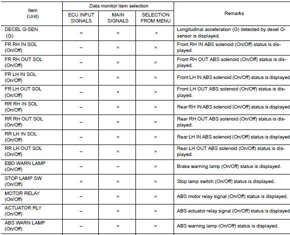 | Data Monitor | The ABS actuator and electric unit (control unit) input/output data is displayed in real time. |