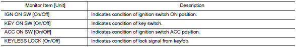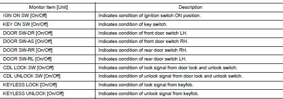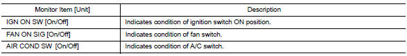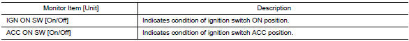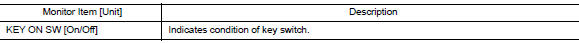 | BRAKE SW [On/Off] | Indicates condition of stop lamp switch signal received from ABS actuator and electric unit (control unit) on CAN communication line. |