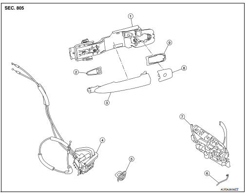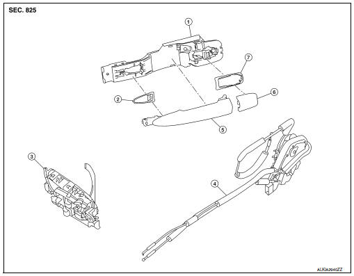 - Remove the front door outside handle. Refer to DLK-173, "FRONT DOOR