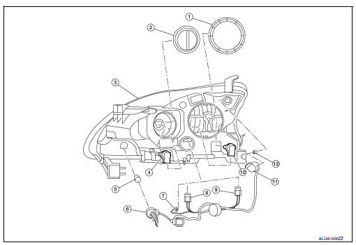 - Remove front combination lamp. Refer to EXL-119, "Removal and
