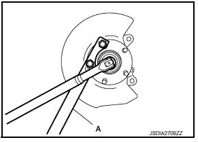 - Hold the wheel hub and bearing using Tool (A). Loosen the