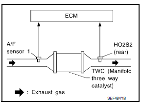The ECM monitors the switching frequency ratio of air fuel ratio (A/F) sensor 1 and heated oxygen sensor 2.