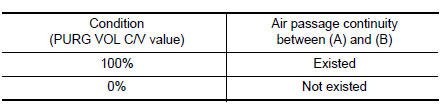 Touch “Qd” and “Qu” on CONSULT screen to adjust “PURG VOL C/V” opening and check air passage continuity of EVAP canister purge volume control solenoid valve as per the following conditions.