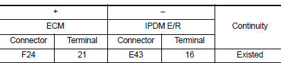 Check the continuity between ECM harness connector and IPDM E/R harness connector.