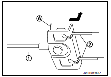 Pull equalizer (A) of the front parking brake cable (1) in a rearward direction and then push upward to remove each rear parking brake cable (2)