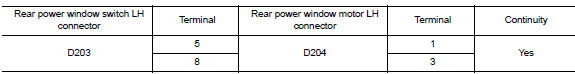 Check motor operation by connecting the battery voltage directly to rear power window motor LH D204.