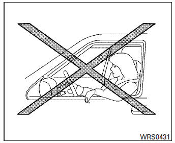 | WARNING The seat belts, the side air bags and curtain air bags are most effective when you are sitting well back and upright in the seat with both feet on the floor. The side air bag and curtain air bag inflate with great force. Do not allow anyone to place their hand, leg or face near the side air bag on the side of the seatback of the front seat or near the side roof rails. Do not allow anyone sitting in the front seats or rear outboard seats to extend their hand out of the window or lean against the door. Some examples of dangerous riding positions are shown in the previous illustrations. |