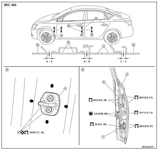 Rear door lower hinge bolts 22 NВ·m (2.2 kg-m, 16 ft-lb)