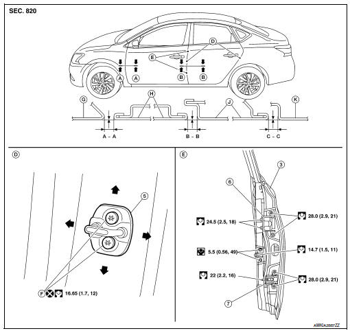 Rear door lower hinge bolts 22 NВ·m (2.2 kg-m, 16 ft-lb)