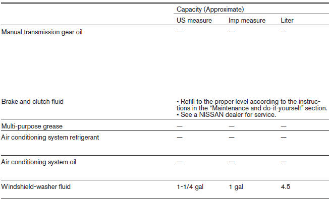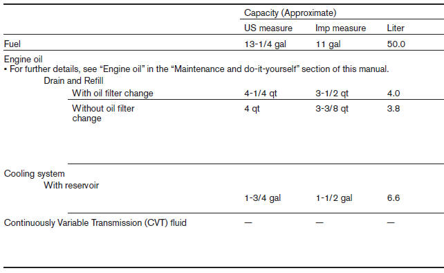 The following are approximate capacities. The actual refill capacities may be slightly different. When refilling, follow the procedure described in the “Maintenance and do-it-yourself” section to determine the proper refill capacity.