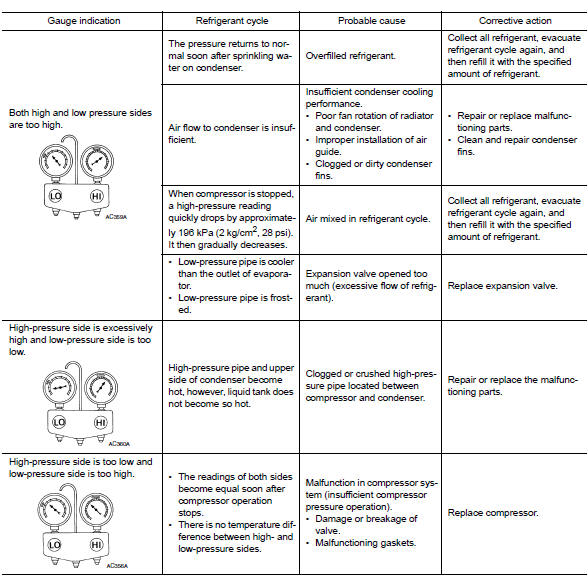 Diagnose using a manifold gauge whenever system’s high and/or low side pressure(s) is/are unusual. The marker above the gauge scale in the following tables indicates the standard (usual) pressure range. Refer to above table (Ambient air temperature-to-operating pressure table) since the standard (usual) pressure, however, differs from vehicle to vehicle.