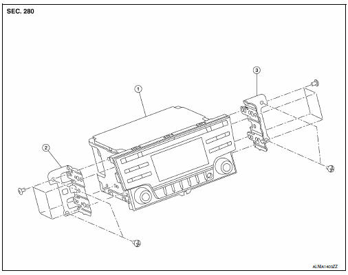 - Disconnect the harness connectors from the audio unit and remove.
