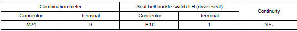 Check continuity between seat belt buckle switch lh (driver seat) harness connector b16 terminal 2 and ground.