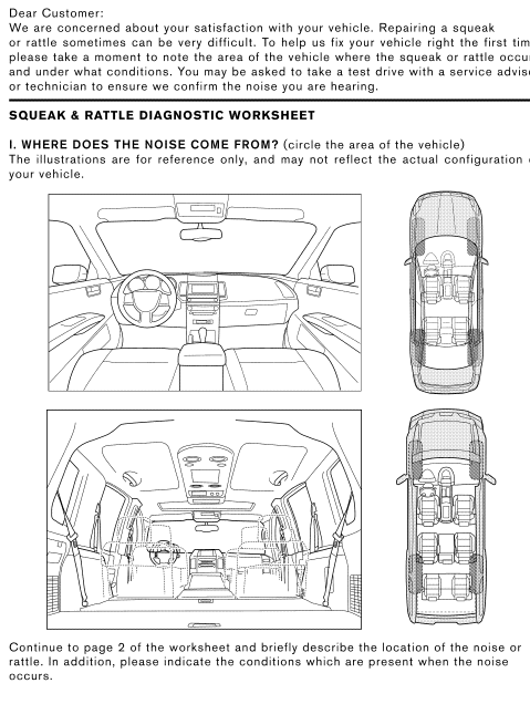 Interview the customer if possible, to determine the conditions that exist when the noise occurs. Use the Diagnostic Worksheet during the interview to document the facts and conditions when the noise occurs and any customer's comments; refer to IP-12, "Diagnostic Worksheet". This information is necessary to duplicate the conditions that exist when the noise occurs.