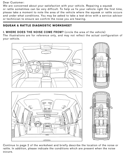 Interview the customer if possible, to determine the conditions that exist when the noise occurs. Use the diagnostic worksheet during the interview to document the facts and conditions when the noise occurs and any customer's comments; refer to dlk-294, "diagnostic worksheet". This information is necessary to duplicate the conditions that exist when the noise occurs.