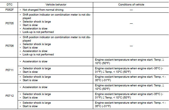 If the vehicle shows following behaviors including “poor acceleration”, a malfunction of the applicable system is detected by TCM and the vehicle may be in a fail-safe mode. At this time, check the DTC code and perform inspection and repair according to the malfunction diagnosis procedures.