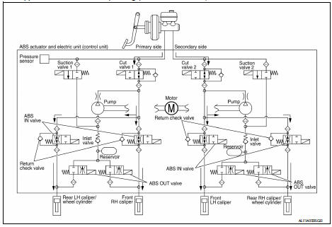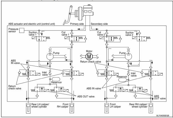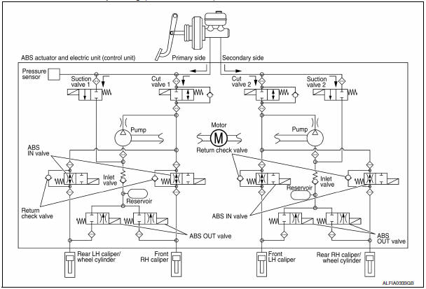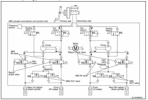 Brake fluid is supplied to the front LH brake caliper from the master cylinder through the cut valve 2 and the ABS IN valve. Since the suction valve 2 and the ABS OUT valve is closed, the fluid does not flow into the reservoir. The amount of brake fluid supplied to the front LH brake caliper from the master cylinder is controlled according to time that the ABS IN valve is not energized (time that the ABS IN valve is open).