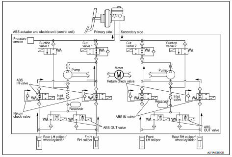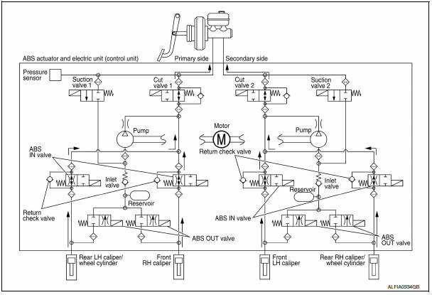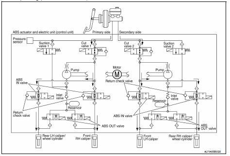 Brake fluid is supplied to the front LH brake caliper through the return check valve of the ABS IN valve and the cut valve 2, and returns to the master cylinder.
