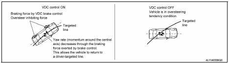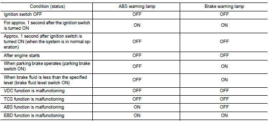 VDC warning lamp in combination meter turns ON when a malfunction occurs in system [ABS actuator and electric unit (control unit)]. The control is suspended for VDC and TCS functions. However, ABS and EBD functions operate normally.