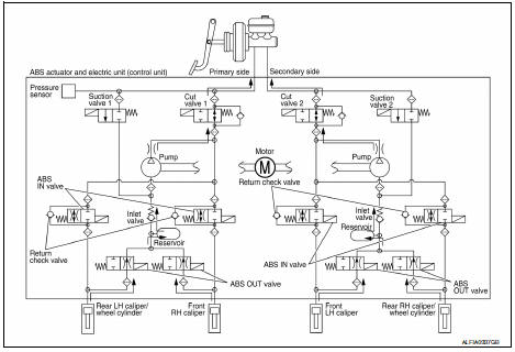 The control unit built in the ABS actuator and electric unit (control unit) controls fluid pressure of the brake calipers by operating each valve.