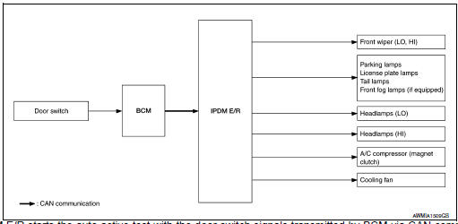 | BCM | The BCM receives the fan ON and A/C ON signals from the A/C auto amp. and sends a compressor ON request to the ECM. |