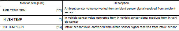 | Ambient sensor | The ambient sensor measures the temperature of the air surrounding the vehicle. The sensor uses a thermistor which is sensitive to the change in temperature. The electrical resistance of the thermistor decreases as temperature increases. |