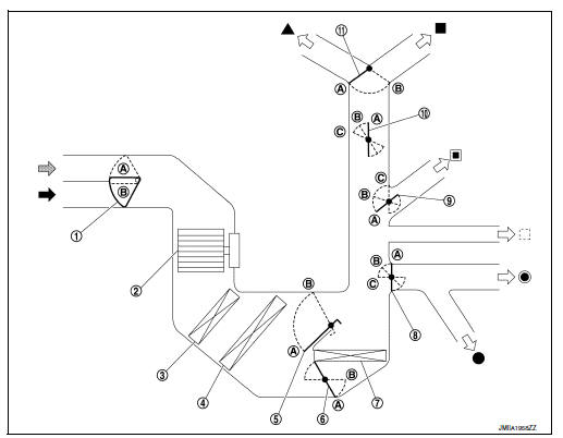 The intake door is automatically controlled by the temperature setting, ambient temperature, in-vehicle temperature, intake temperature, amount of sunload and ON/OFF operation of the compressor.