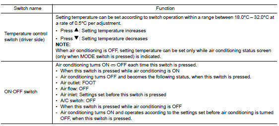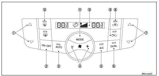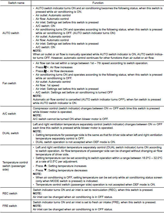 | A/C switch assembly | The A/C switch assembly controls the operation of the A/C and heating system based on inputs from the temperature control knob, the mode switches, the blower control dial, the ambient temperature sensor, the intake sensor, and inputs received from the ECM across the CAN. Diagnosis of the A/C switch assembly can be performed using the CONSULT. |