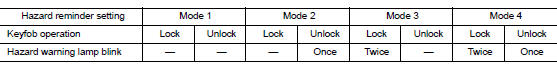 When the doors are locked or unlocked by keyfob, power is supplied to sound horn and flash hazard warning lamps as a reminder The hazard and horn reminder has C mode (horn chirp mode) and S mode (non-horn chirp mode).