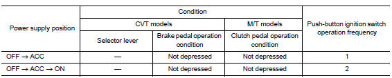 *: For the engine start condition, refer to “IGNITION SWITCH POSITION CHANGE TABLE BY PUSH-BUTTON IGNITION SWITCH OPERATION” below.
