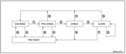 The PRE-ARMED phase is the transient state between the DISARMED phase and the ARMED phase. This phase is maintained for 30 seconds, so that the owner can reset the setting due to a mis-operation. This phase switches to the ARMED phase when vehicle conditions are not changed for 30 seconds. Security indicator lamp illuminates while being in this phase.