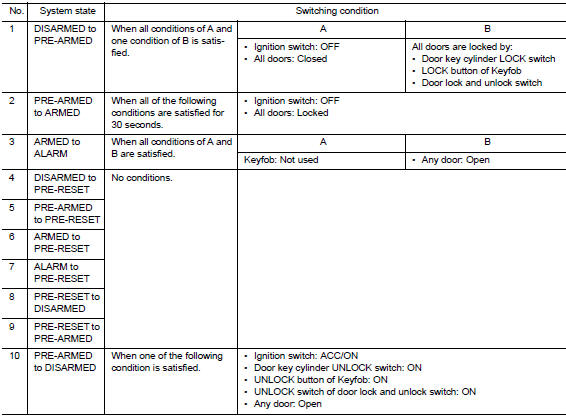 To reset the PRE-ARMED phase, refer to the switching condition of No. 10 in the table above.