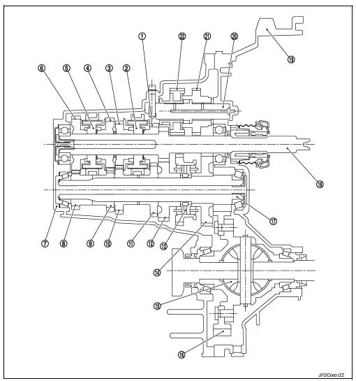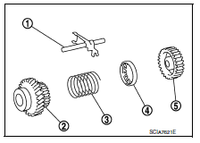 Reverse gear assembly consists of reverse input gear, return spring, reverse baulk ring, and reverse output gear. When the shifter lever is moved to the reverse position, the construction allows smooth shift operation by stopping the reverse idler shaft rotation by frictional force of synchronizer.