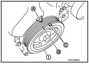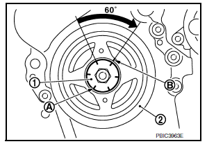 - Put a paint mark (B) on crankshaft pulley (2), matching with any
