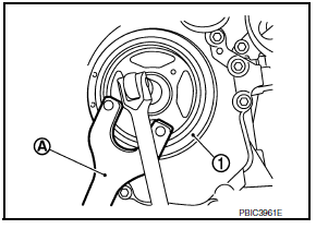 - Attach Tool (A) in the M6 thread hole on crankshaft pulley (1),