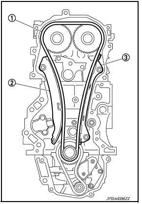 - Remove slack guide (2), tension guide (3) and timing chain (1).