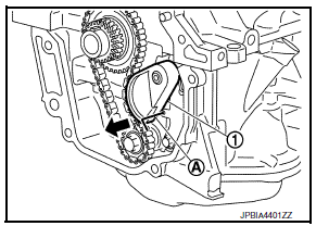 - Push oil pump drive chain tensioner (1) in the direction as