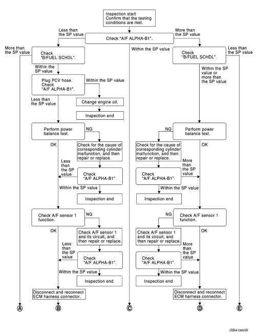 Select “A/F ALPHA-B1” and “B/FUEL SCHDL” in “SPEC” of “DATA MONITOR” mode, and make sure that each indication is within the SP value.