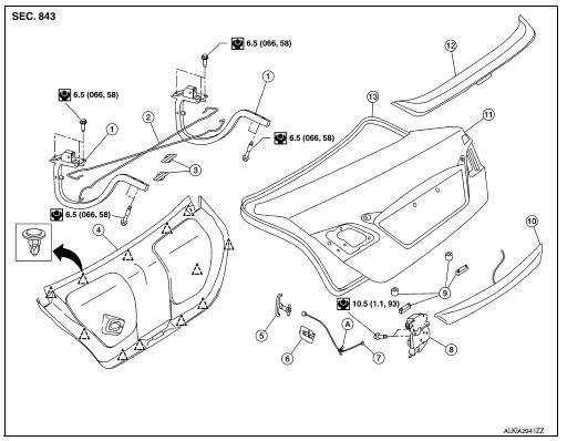 - Remove trunk lid assembly. Refer to DLK-330, "TRUNK LID ASSEMBLY :