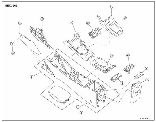 - Remove the center console assembly. Refer to IP-17, "Removal and