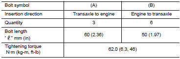 Tighten transaxle assembly mounting bolts to the specified torque. As shown viewing from the engine.