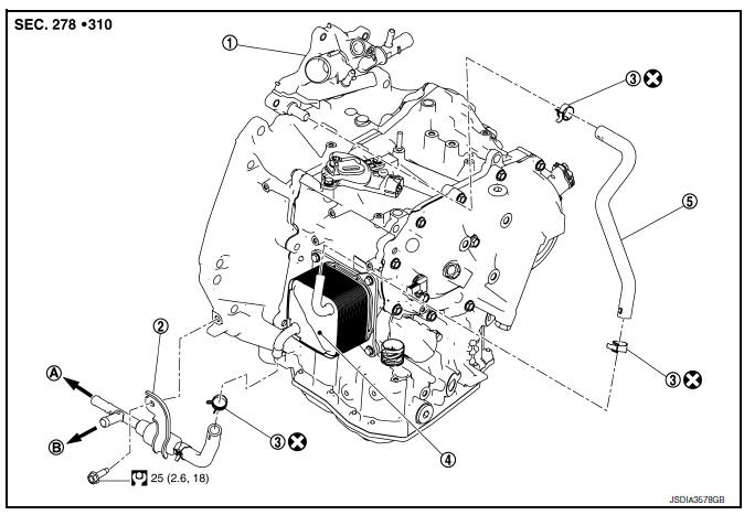 | Heater thermostat assembly | CVT oil warmer | Frontward | (A): 27 mm (1.06 in) (Hose end reaches the 2-stage bulge.) |